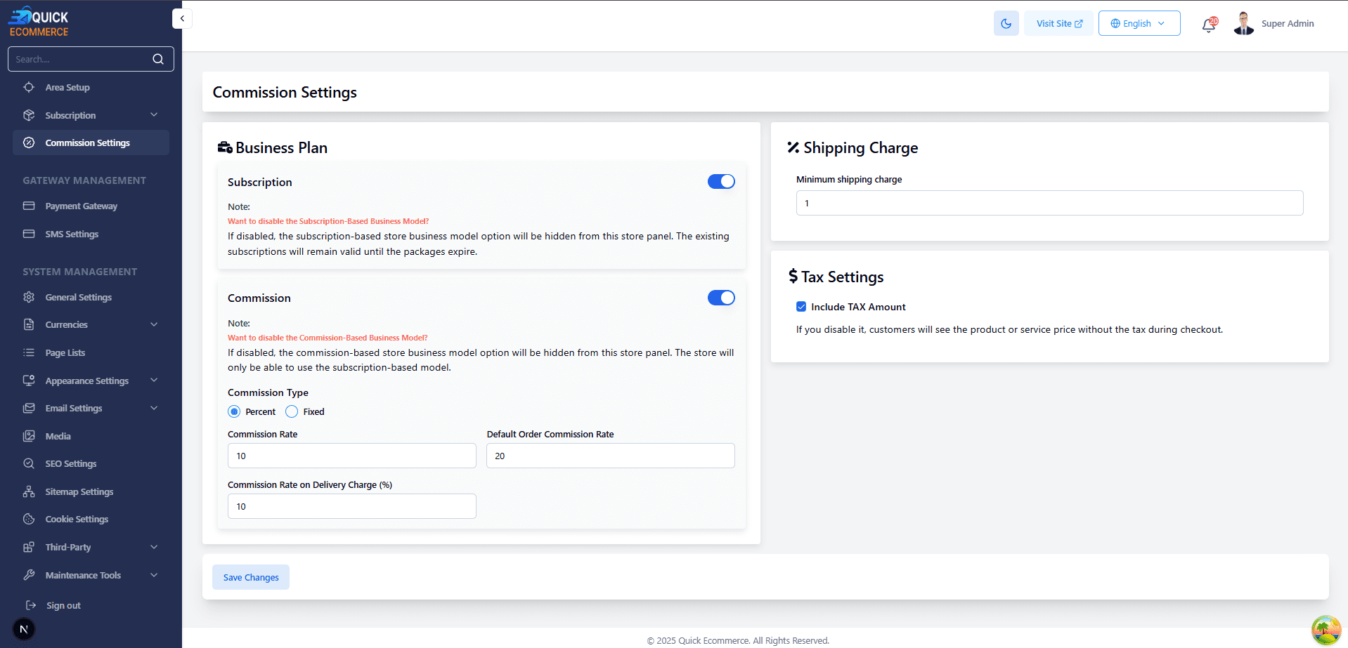 Admin can configure multiple business models by enabling commission-based or subscription-based earnings for seller stores.