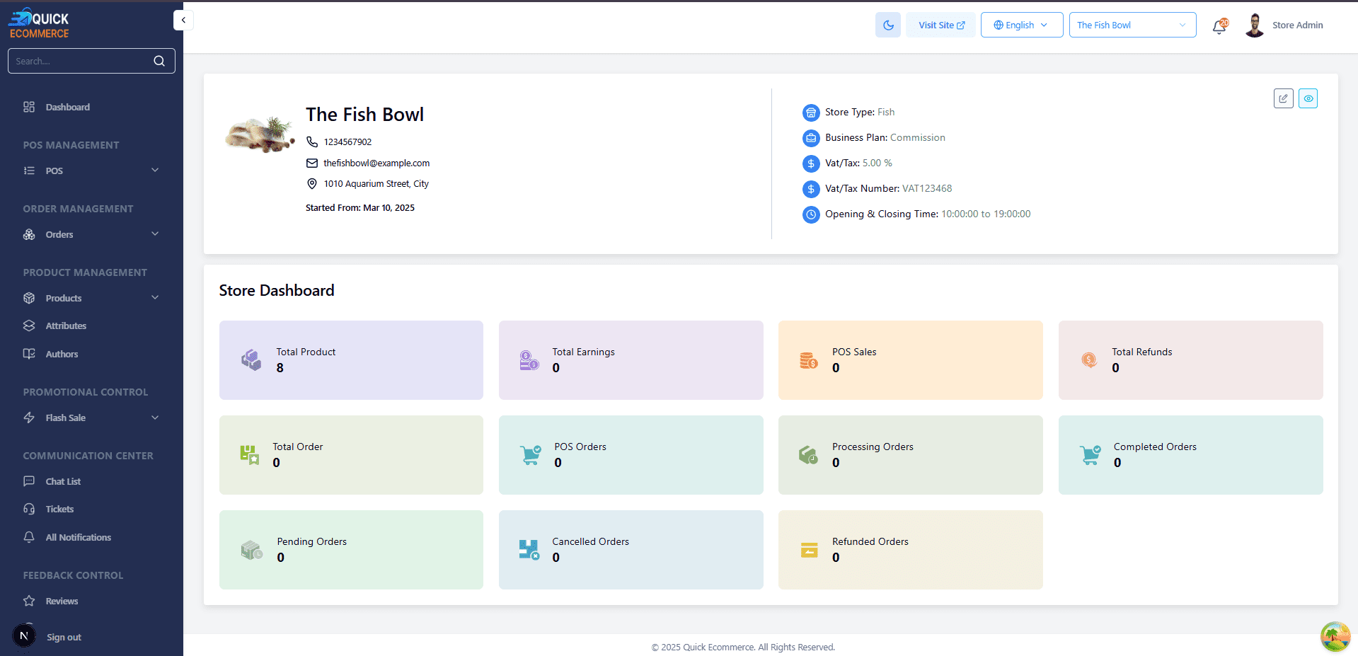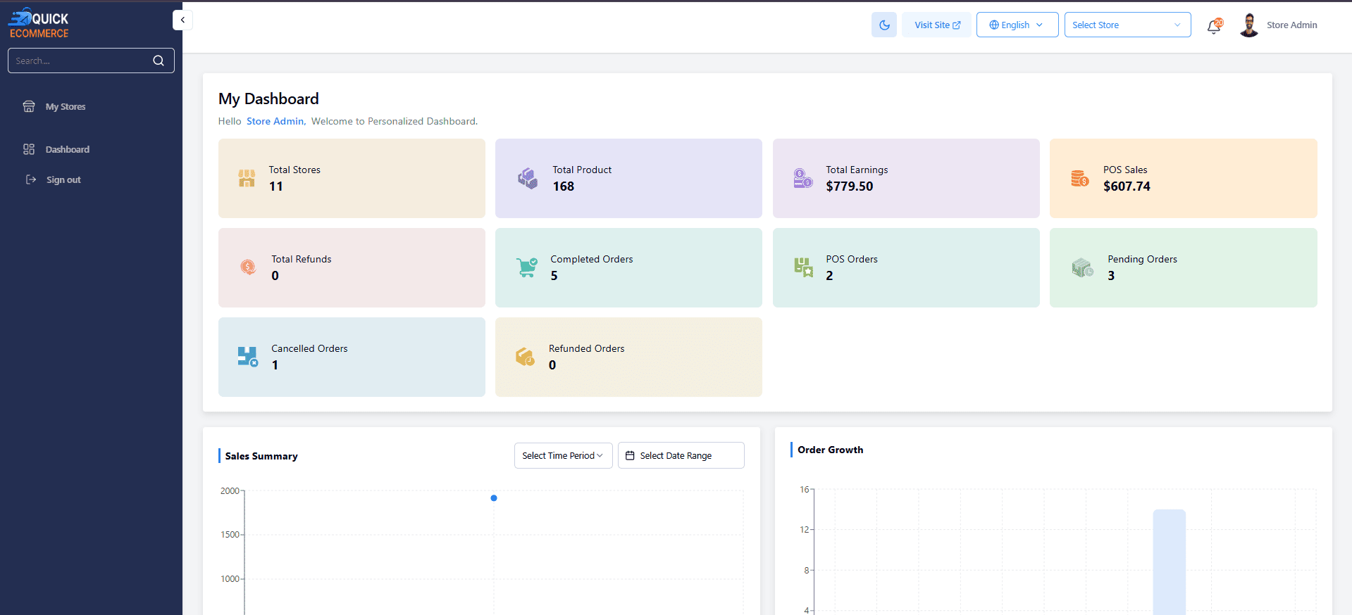 Quick Ecommerce admin has a powerful dashboard designed for tracking, managing, and optimizing their part of the business