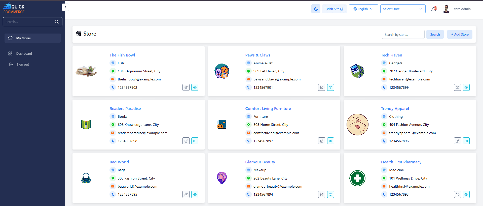 Easily create, update, and manage multiple stores from a single seller account. Supports different store types and categories with flexible settings.