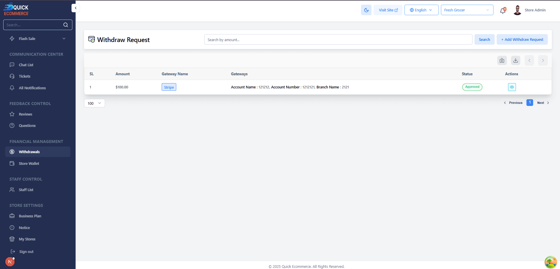 Sellers can request withdrawals from their store wallet. Admin can review and approve payouts based on earning thresholds and withdrawal history.